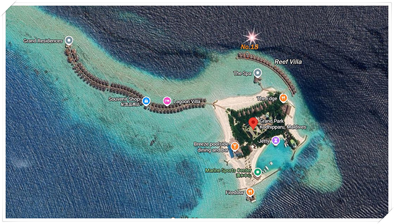 君樂度假村的水上別墅分兩區:一為東北邊的礁湖水上屋(均有泳池),另一為西北邊的瀉湖水上屋(前1/3無泳池)。我們第一晚住的就是東北邊的礁湖泳池水上屋 No.18。